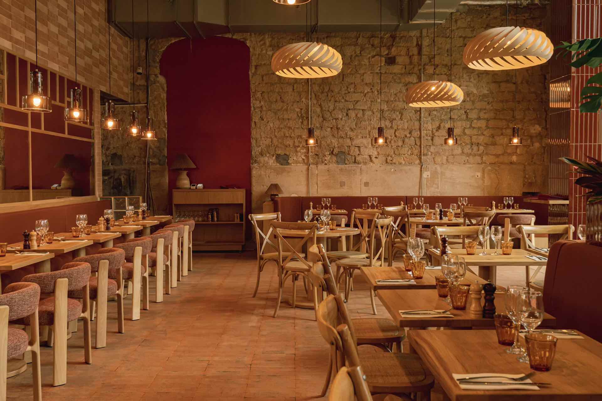 Au fond de l’ancienne caserne de pompiers, à deux pas de Gare du Nord et de Gare de l’Est, Brûlant s’impose comme un refuge inattendu dans le tumulte parisien. Ici, la chaleur ne vient pas des flammes, mais du moment. Derrière les murs de pierre et sous la lumière généreuse qui inonde la vaste terrasse, le lieu vibre d’une énergie à la fois douce et gourmande. L’identité ? Signée Abmo. Le design intérieur ? Entre Valentine Richardson et Justine Chateaux, qui ont imaginé un cocon rouge brique, réconfortant, jamais clinquant.