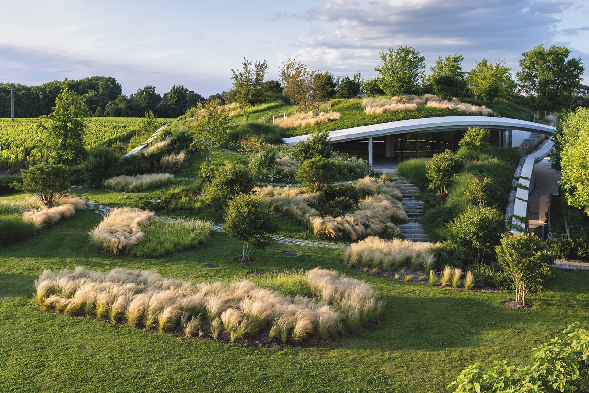 Depuis la terrasse panoramique au sol de pierres colorées évoquant les grappes de raisin, les visiteurs peuvent admirer les parcelles de Saint-Émilion, Pomerol et Fronsac. Philippe Starck pour Les Carmes Haut-Brion (Graves) a opté pour une coque renversée en lames d’acier, tel un sous-marin échoué dans un plan d’eau. Le chai à barriques sous le bassin y bénéficie d’une hygrométrie et d’une température idéales.