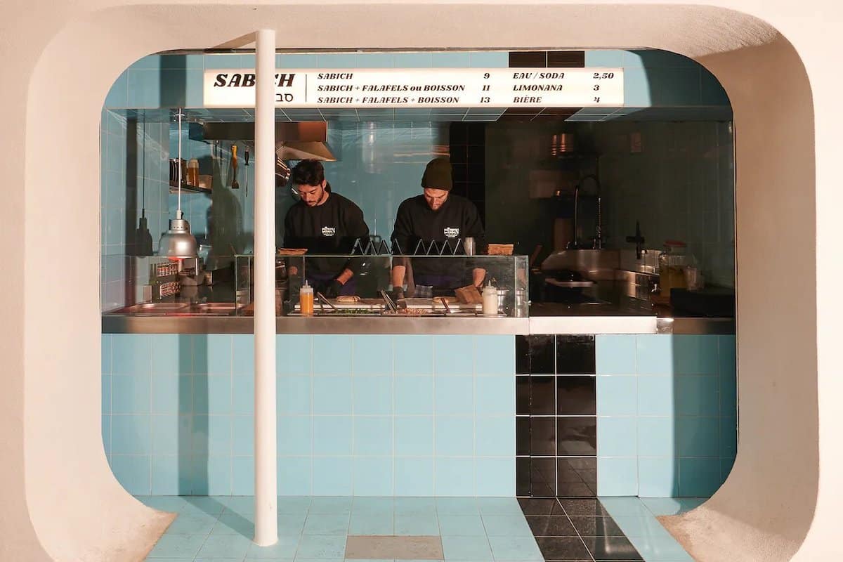Ce sandwich incontournable de la street food israélienne est à l’honneur dans cette petite échoppe tout droit sortie des seventies. Chacun en ressort avec entre les mains un pain pita farci d’aubergines frites, œuf mollet mariné, betterave cuite en croûte de sel, choux, céleri, oignon, pomme de terre infusée, le tout assaisonné de quelques herbes et épices méditerranéennes.