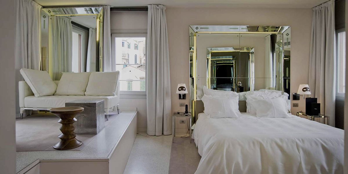 Starck n’allait quand même pas manquer son rendez-vous avec Venise… Le Palazzina G est attenant au Palazzo Grassi, le musée de la fondation Pinault. Petit conseil quand même : mieux vaut éviter l’hôtel en période de doute personnel ou de down passager. Si maître Stark a évidemment signé les chambres de son désormais célèbre blanc apaisant, il s’est également adonné à des jeux de miroirs incessants qui nous laissent assez peu de chance d’éviter de tomber nez à nez avec nous-même.. On adore l’endroit mais d’abord quand on s’adore. « Oh Miroir, dis-moi… »