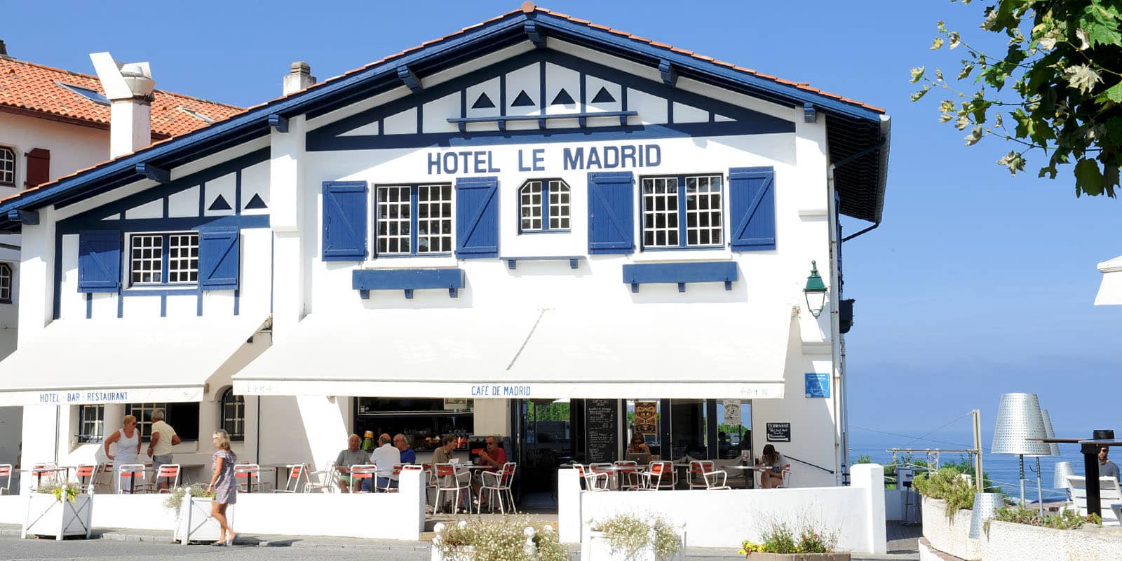 Anciennement buvette en bois puis siège social de la société de pelote, l’âme du lieu est restée intacte, dans une atmosphère unique et chargée d’histoire. En plein cœur de Guéthary, Le Madrid est un bel hôtel de bord de mer avec sa façade bleue et blanche. Les cinq chambres confortables à la décoration épurée rappellent celles des maisons de famille. On y monte d’ailleurs depuis le restaurant, comme si l’on était les enfants du patron.