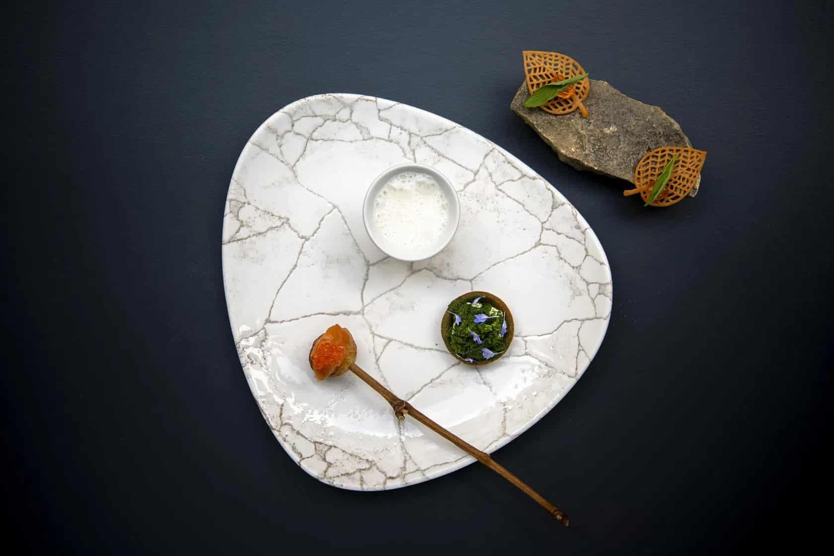 Ce qui nous a le plus marqué, c’est sa vision responsable de la cuisine française. D’abord au regard de son « respect immodéré pour les petits producteurs et leurs produits » qu’il aime travailler « dans leur intégralité, jusqu’à la racine, jusqu’à l’os ». Mais aussi à la lecture de ses collaborations, notamment avec Bottes en ville, défenseur d’une agriculture raisonnée voire bio, et Hydropousse, ferme verticale au beau milieu de Paris. Une approche verte qui n’est pas pour nous déplaire !