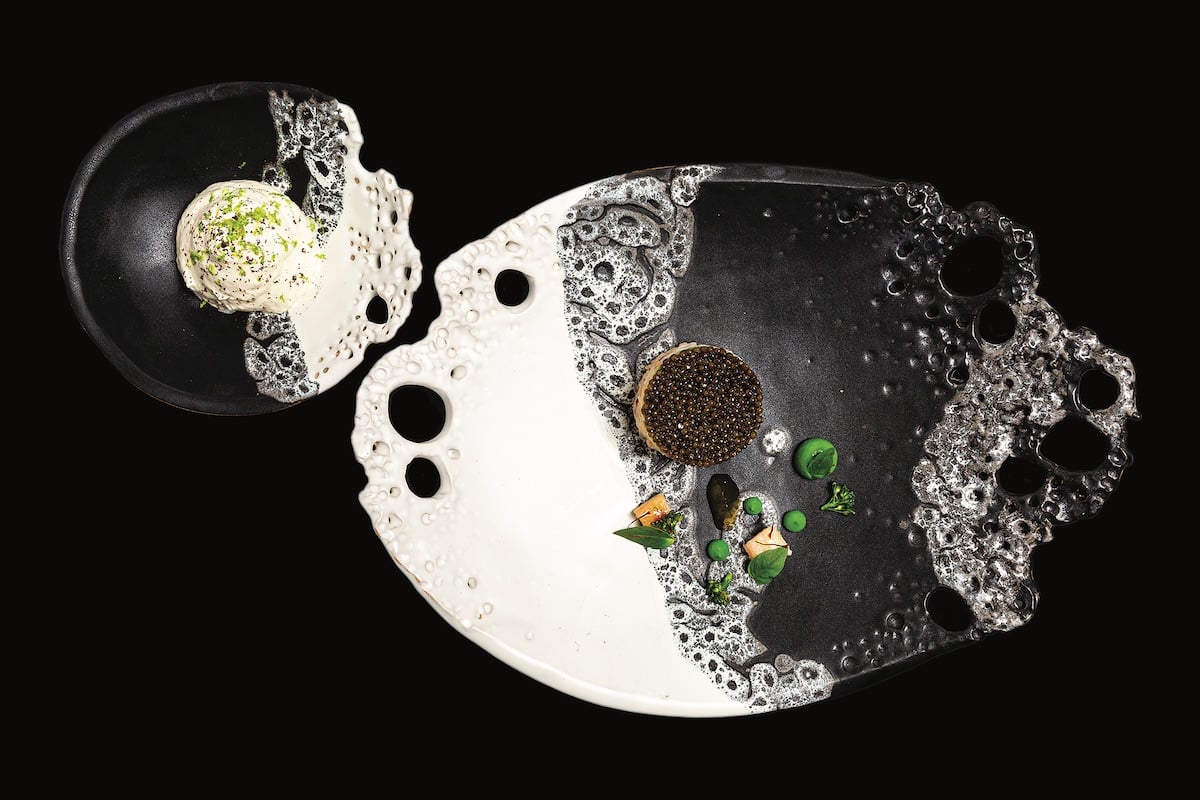 Lovées dans un écrin imaginé par Tristan Auer, les quatre tables ont un lien privilégié avec la cuisine ouverte sur la salle. Les convives se laisseront guider pour découvrir le menu dégustation d’une quinzaine de plats.