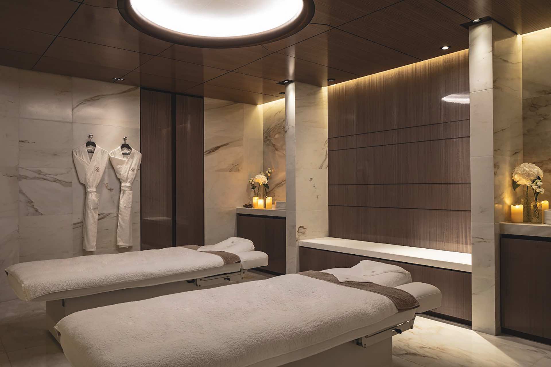 À deux pas des Champs-Élysées, le Bulgari Spa conjugue avec justesse luxe contemporain et volupté méditerranéenne. Véritable écrin de sérénité, la Spa Suite – inspirée du Panthéon de Rome – accueille les duos en quête d’exception dans un espace privé de 65 m². Soin en tandem, hammam intime, hydromassage en onyx vert : chaque détail invite à la déconnexion, dans un décor à la fois somptueux et apaisant. En point d’orgue de cette parenthèse hors du temps, quelques bulles de champagne et des mignardises délicates scellent avec douceur un moment à deux.