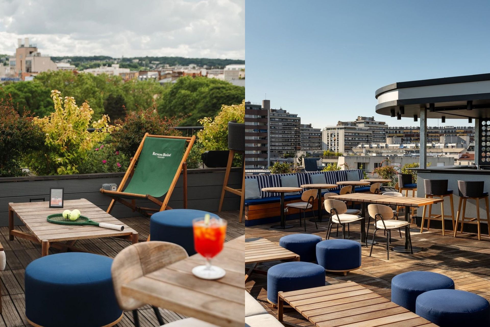 L’oasis de verdure depuis lequel on entraperçoit la tour Eiffel s’affiche comme le lieu idéal pour l’afterwork, de 16h30 à 23h. On s’y retrouve pour fêter Roland-Garros, puisque Le Parchamp se met aux couleurs du tennis jusqu’au 19 juin. Le rooftop fait une place à un petit pop-up store de la marque Revers Boisé, qui propose des pièces intemporelles à porter sur le court comme dans la vie de tous les jours.