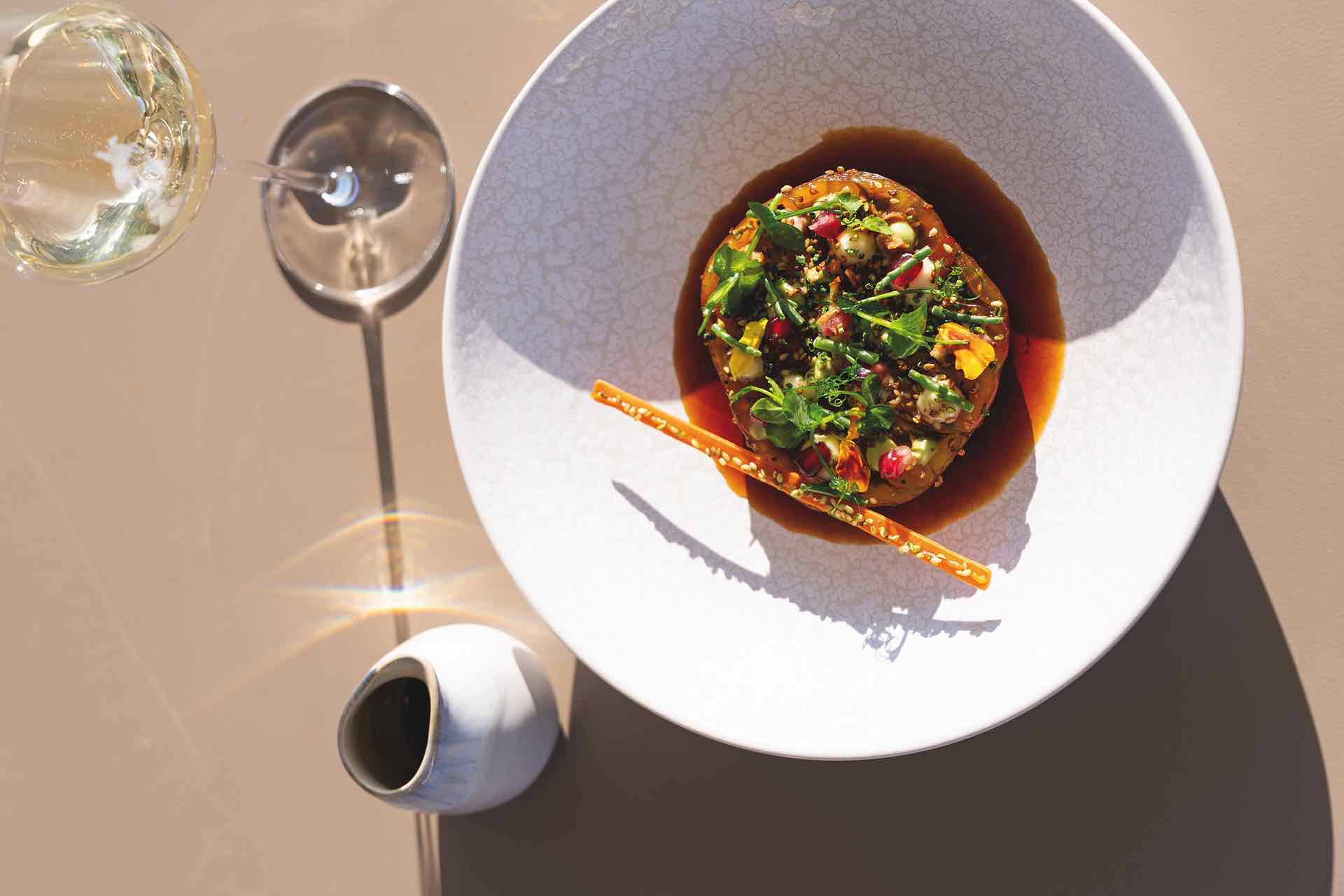 Aux quatre coins de la France, il partage ainsi sa philosophie à table, en s’inspirant des produits de la région. Cet été, au Mas Candille, il met l’accent sur les artichauts et la roquette pour l’entrée, et choisit le wakamé pour accompagner un thon sélectionné dans une démarche écoresponsable. « J’adore les légumes verts, poursuit-il. Ils sont bourrés d’antioxydants, très riches en eau – et en été, ça compte ! Ils favorisent aussi une bonne santé digestive grâce à leur richesse en fibres et, on le sait moins, ce sont des aliments indispensables au bon fonctionnement du cerveau. Quant aux algues, je les utilise souvent pour remplacer l’ajout de sel. »