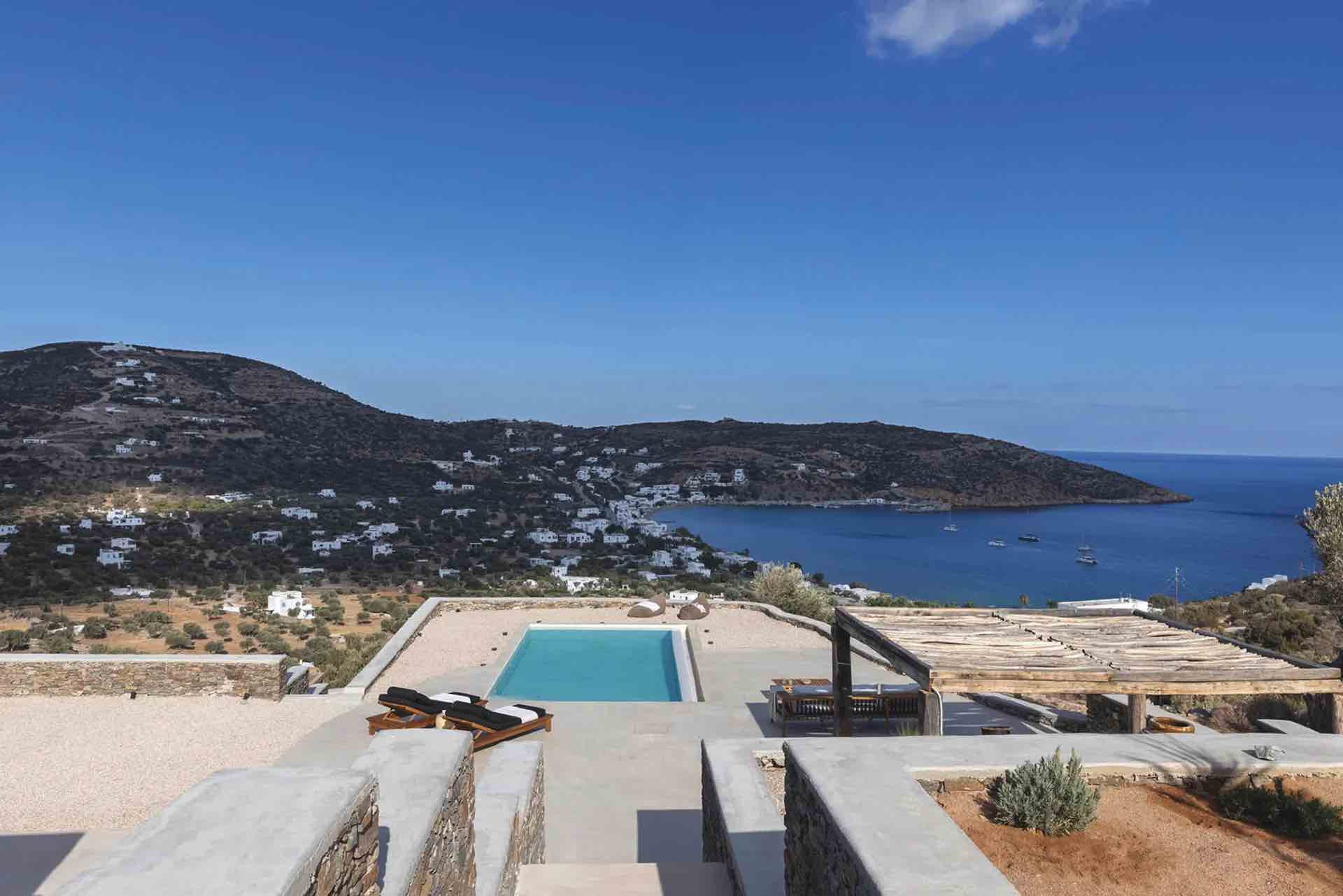 Ensemble de résidences modernes autour des plages de Platis Gialos et Faros. Construites dans le respect de l’architecture locale, elles offrent terrasses et piscines privées, idéales pour les familles ou les tribus.