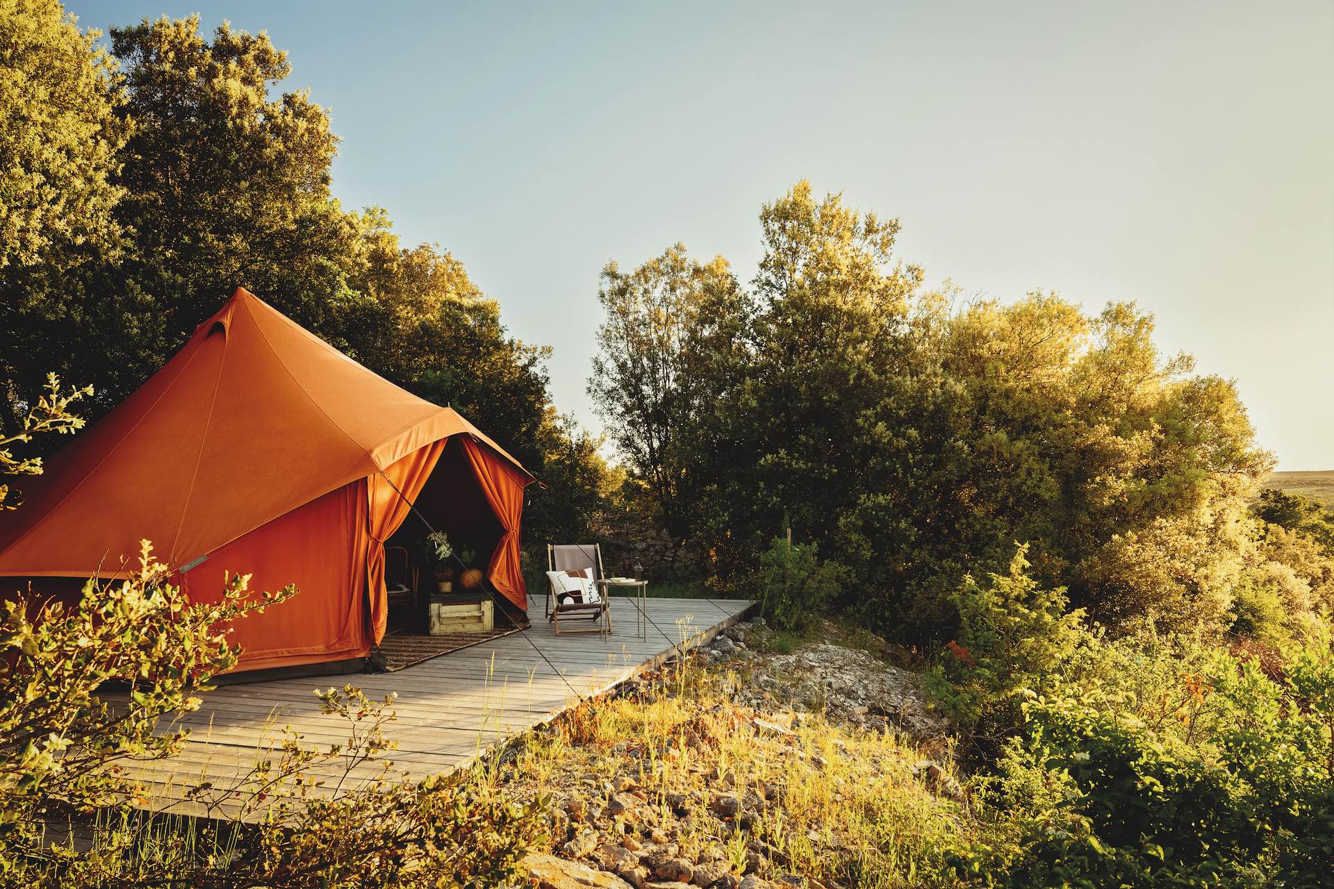 L’offre se développe en effet. Dans le Perche vendômois, au cœur de 42 hectares préservés, Capucine Châtelier et Caroline Costagliola Condy viennent d’ouvrir Repère Sauvage, où les lodges et les chambres du manoir dialoguent avec la forêt. Dans la vallée de la Cèze, entre les Cévennes et l’Ardèche, Rémy et Marc Étienne-Coussedière ont redonné son éclat à une bâtisse du XVIIIe siècle. Longtemps abandonnée, cette demeure de pierre blonde revit depuis un an sous le nom de Mas Re.Source. Cinq chambres d’hôtes et deux maisons indépendantes s’insèrent dans un paysage de lavandes et de vignes. Une « tente d’hôtes » a également été intégrée à l’ensemble, dans la garrigue, à l’écart du mas. Ce refuge de 20 m2, face au Ventoux, met à l’honneur l’art du camping chic.
